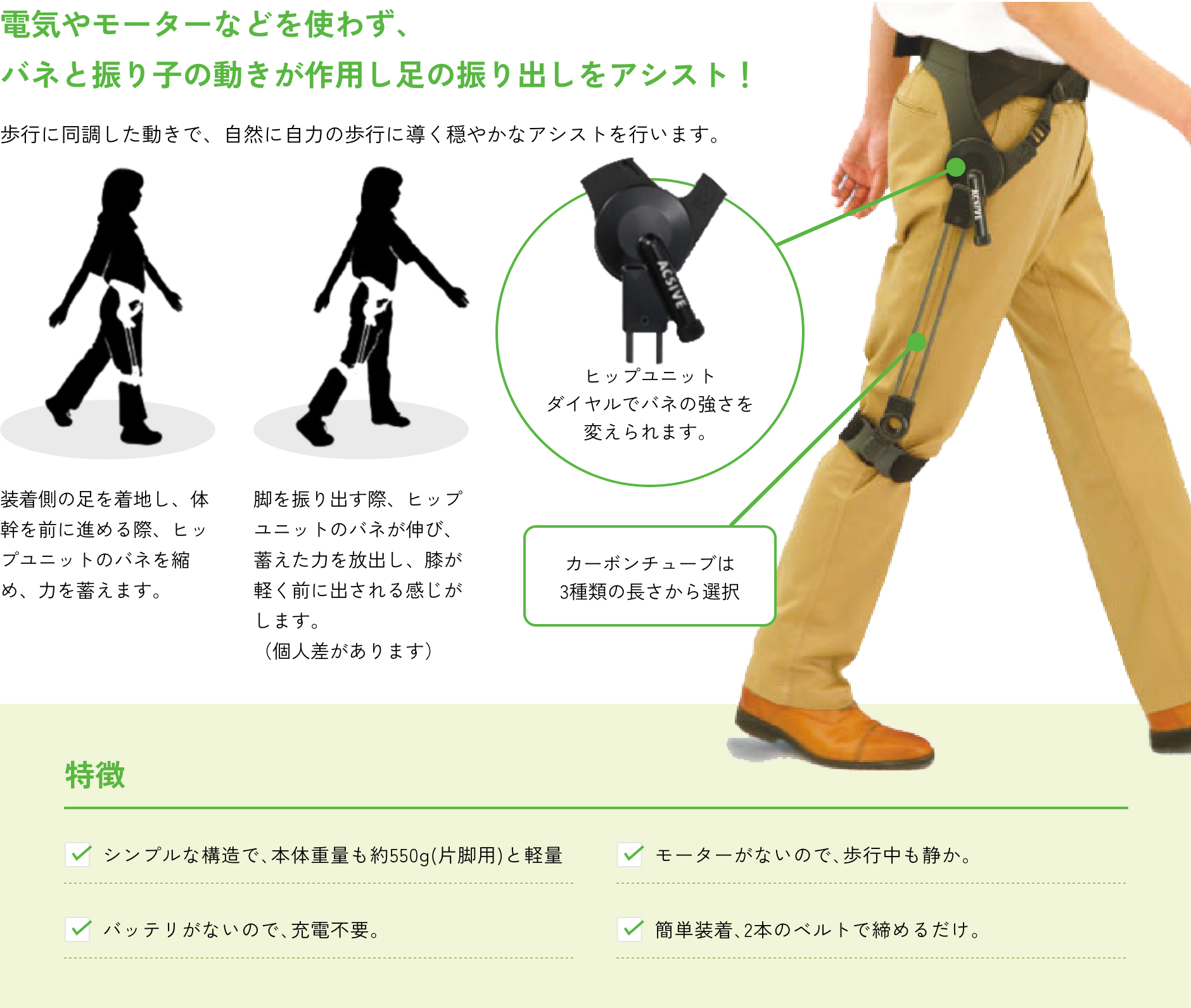 人間の「二足歩行」原理を生かして、モーターやバッテリーを使用せずに、重力とバネの力で歩きが弱った方の歩行イメージを取り戻すことをサポートします。