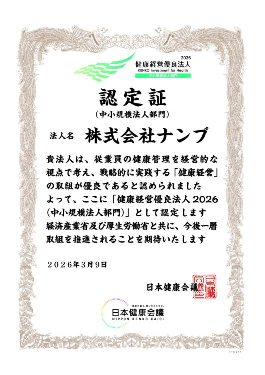 このたび株式会社ナンブ(以下、当社)は、2025年3月9日、経済産業省が制度設計し、日本健康会議が選定する健康経営優良法人認定制度(※)において、『健康経営優良法人2026(中小規模法人部門)』に認定されました。